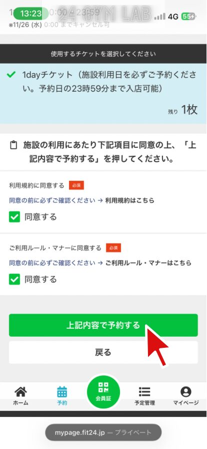 内容が正しければ、画面下の「同意する」にチェックを入れ、「上記内容で予約する」を選択します。