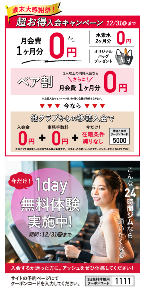 - ペア割:2人以上の同時入会でさらに月会費1ヶ月分0円