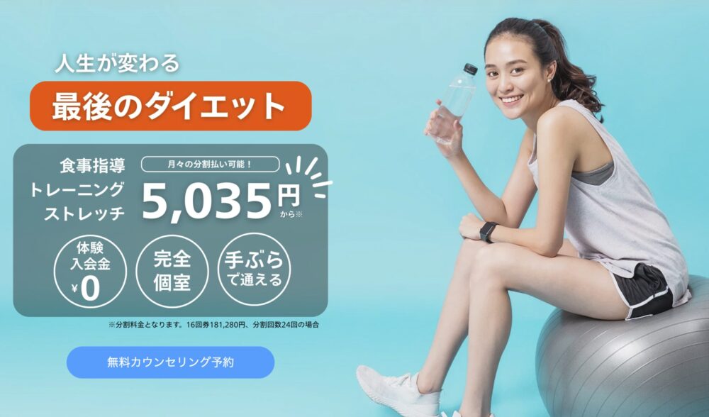 「食事指導付きで結果を出したい」「短期で確実に痩せたいけど、費用は抑えたい」という方には、コスパ・実績ともにバランスの取れた選択肢と言えるでしょう。