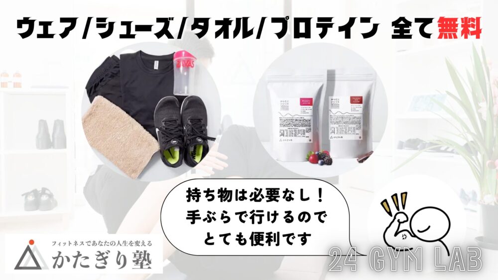 かたぎり塾は、ウェア・シューズ・タオル・プロテインなどが全て無料。